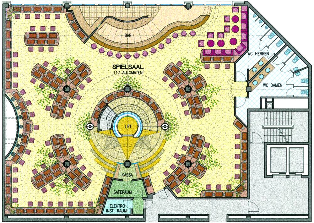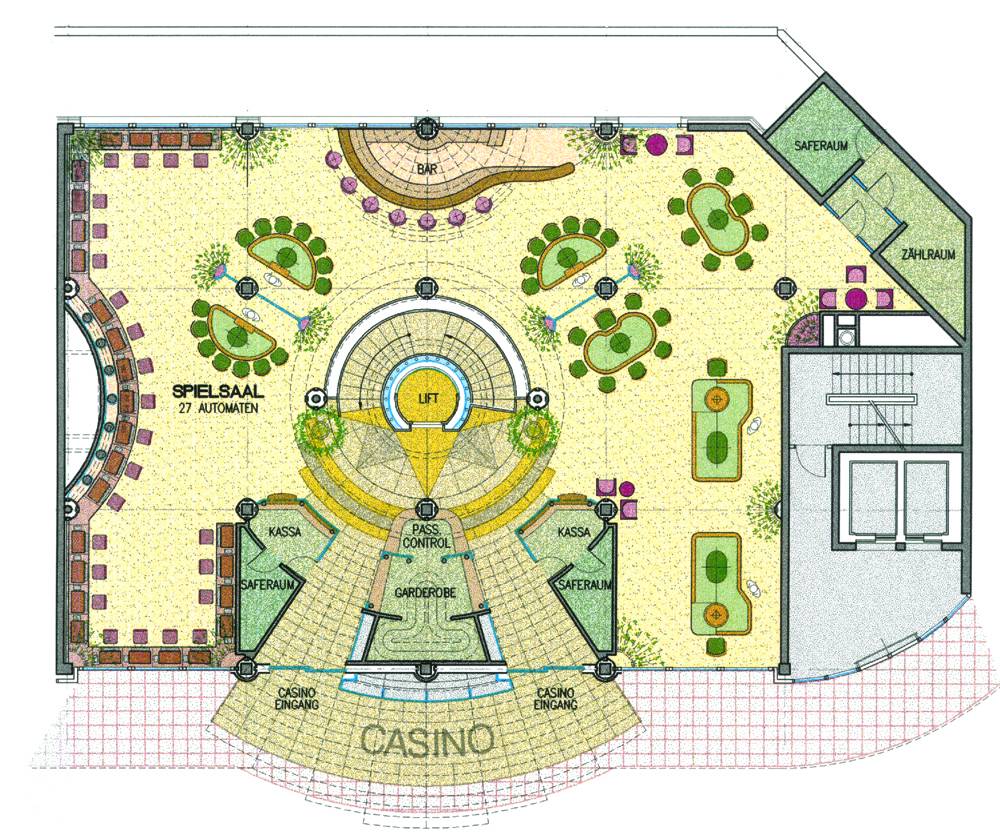Dal 1998 al 2000 il team di architetti e specialisti nella realizzazione di casinò si è concentrato su progetti di varie grandezze elaborando temi e stili sempre nuovi ed unici per ogni casa da gioco. La soluzione scelta per il Grand Places di Friburgo offre un ambiente piacevole e accogliente, nonostante la scala dell’edificio non sia particolarmente importante.